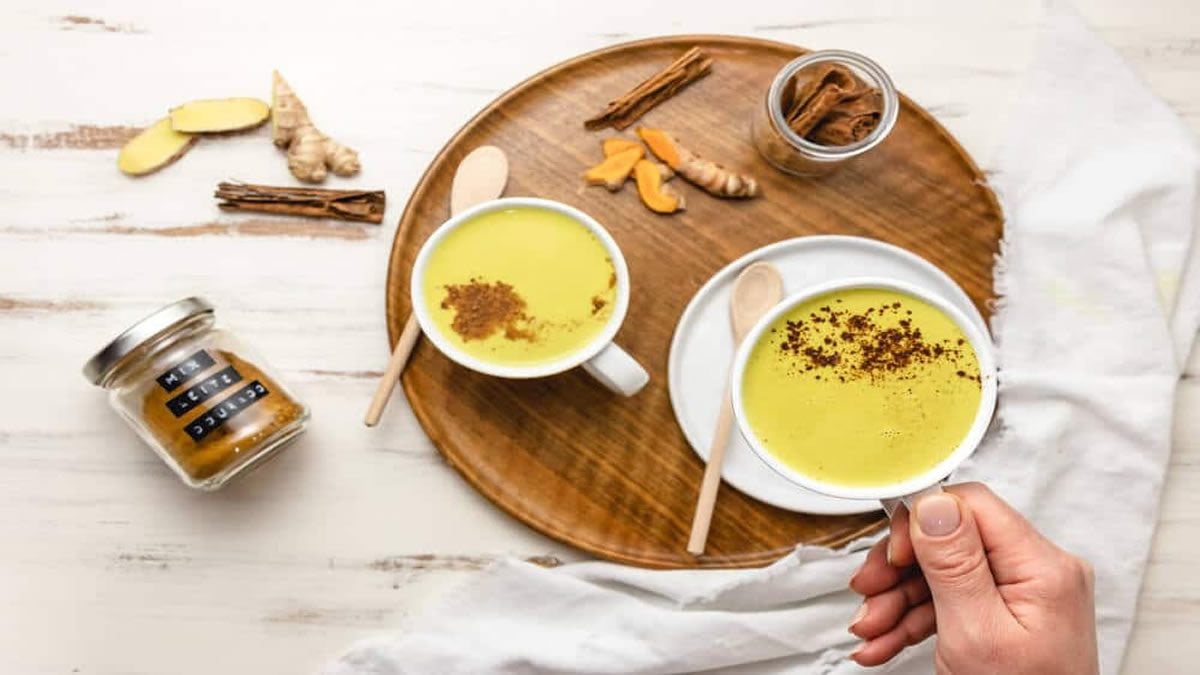 Em uma panela, misture a cúrcuma, o gengibre e o leite.